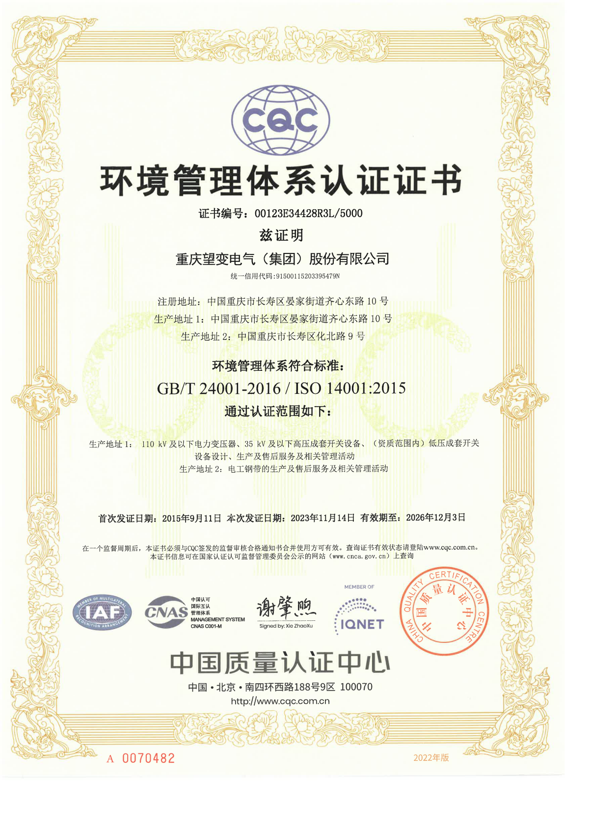 環境管理體係認證證書