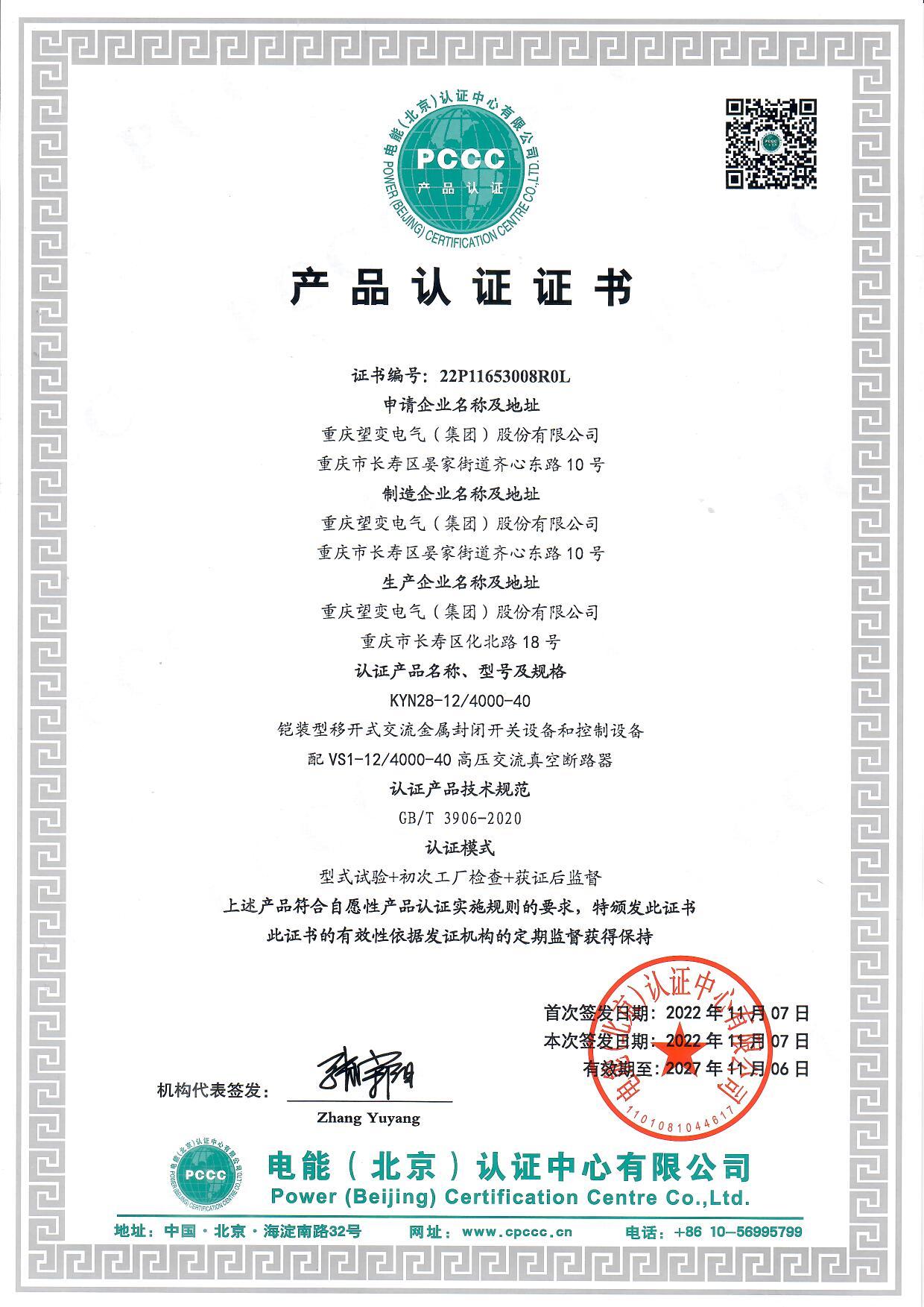 KYN28-12-4000 PCCC認證證書