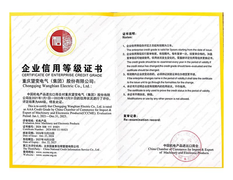 近日,中國機電產品進出口商會(CCCME)公布了2024年度企業信用等級評價結果,重慶望變電氣(集團)股份有限公司獲評AAA級信用等級。CCCME作為我國機電產品進出口行業唯一的全國性商會,企業信用等級評價共分為三等九...