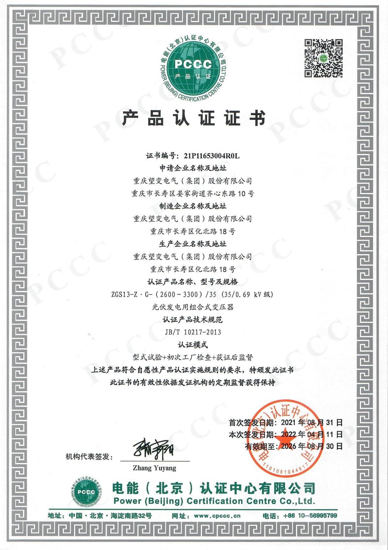 光伏發電用組合變壓器PCCC認證(2600-3300)