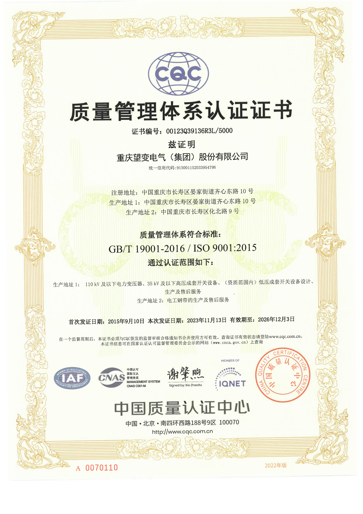 環境管理體係認證證書