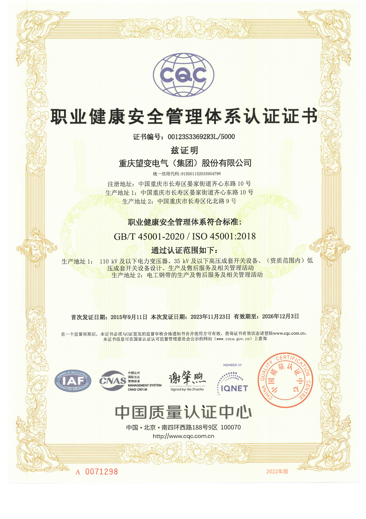 職業健康安全管理體係認證證書