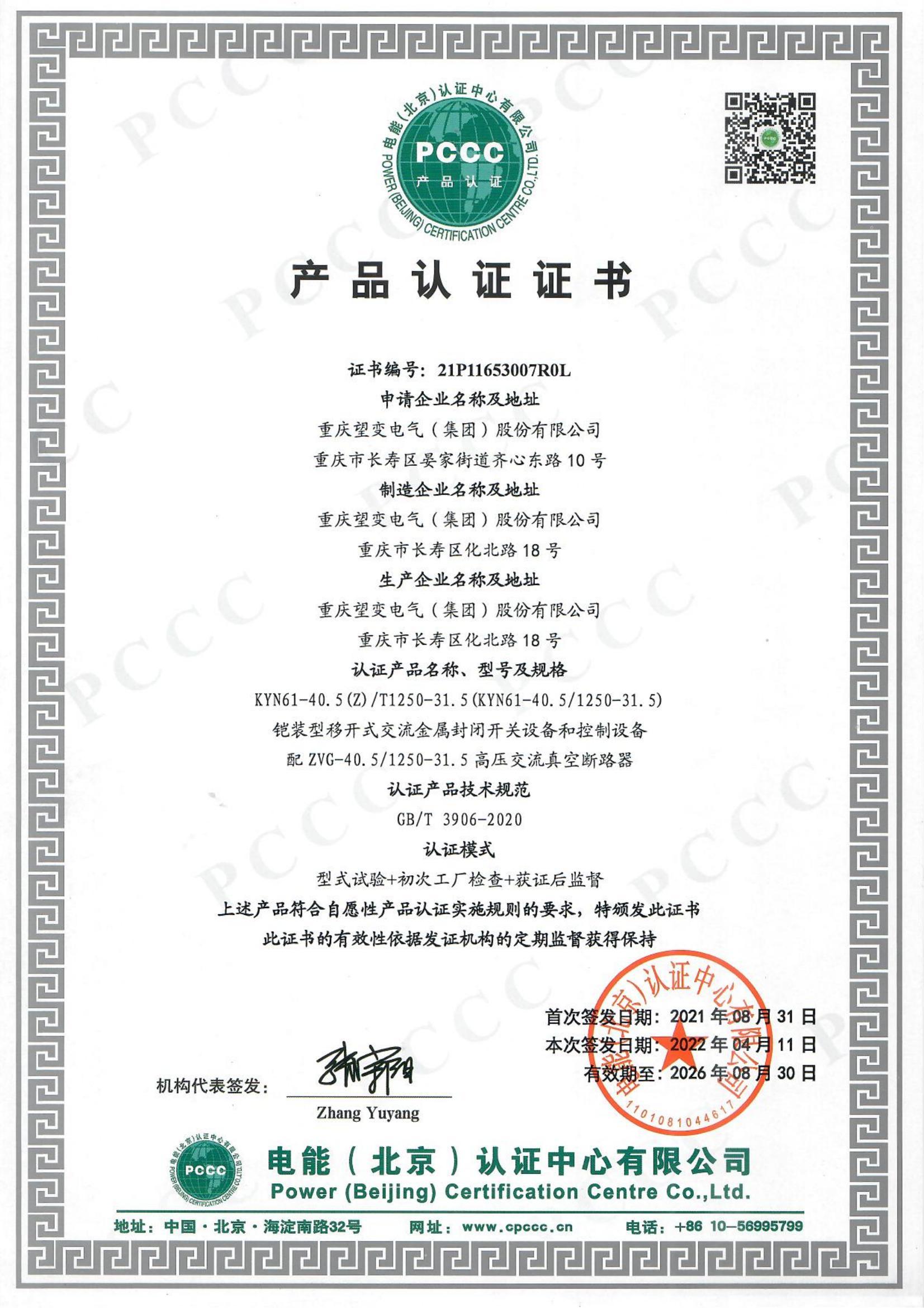 KYN61-40.5-1250-31.5 PCCC認證證書_