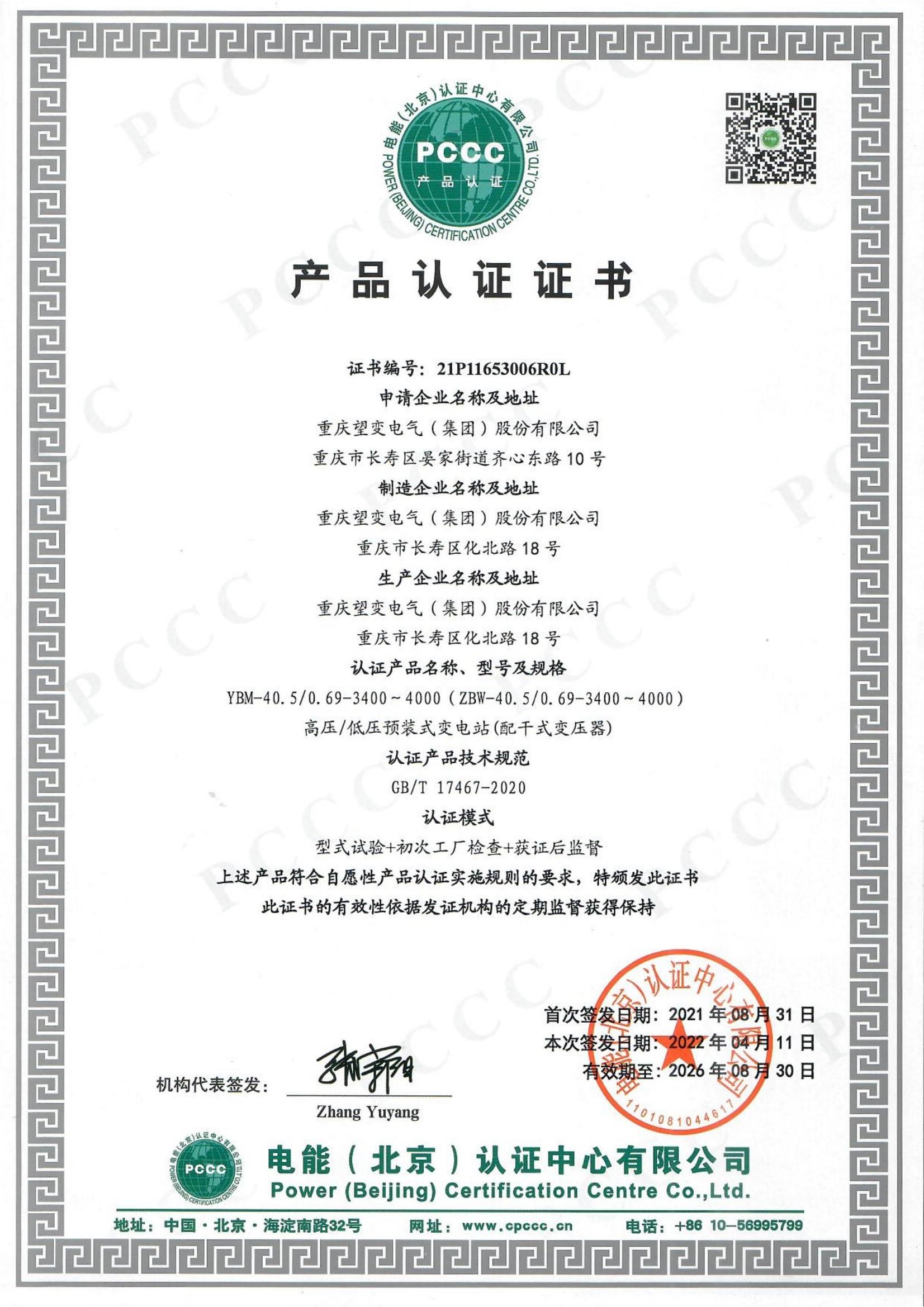 高低壓預裝式變電站PCCC認證(3400-4000)